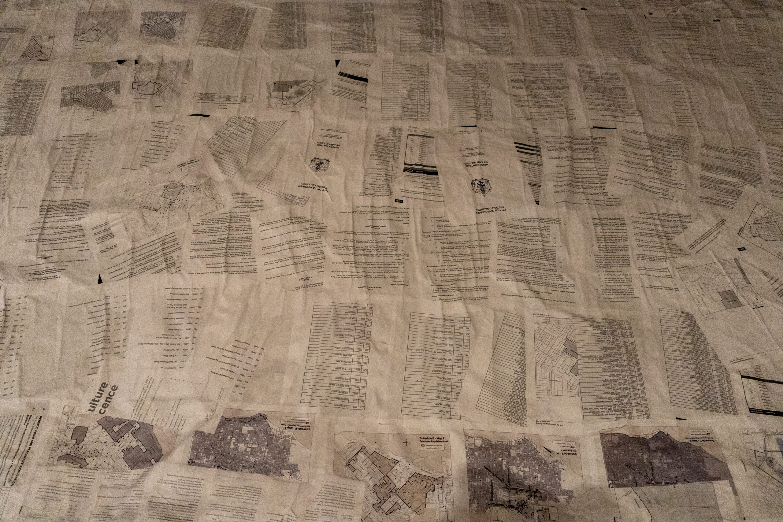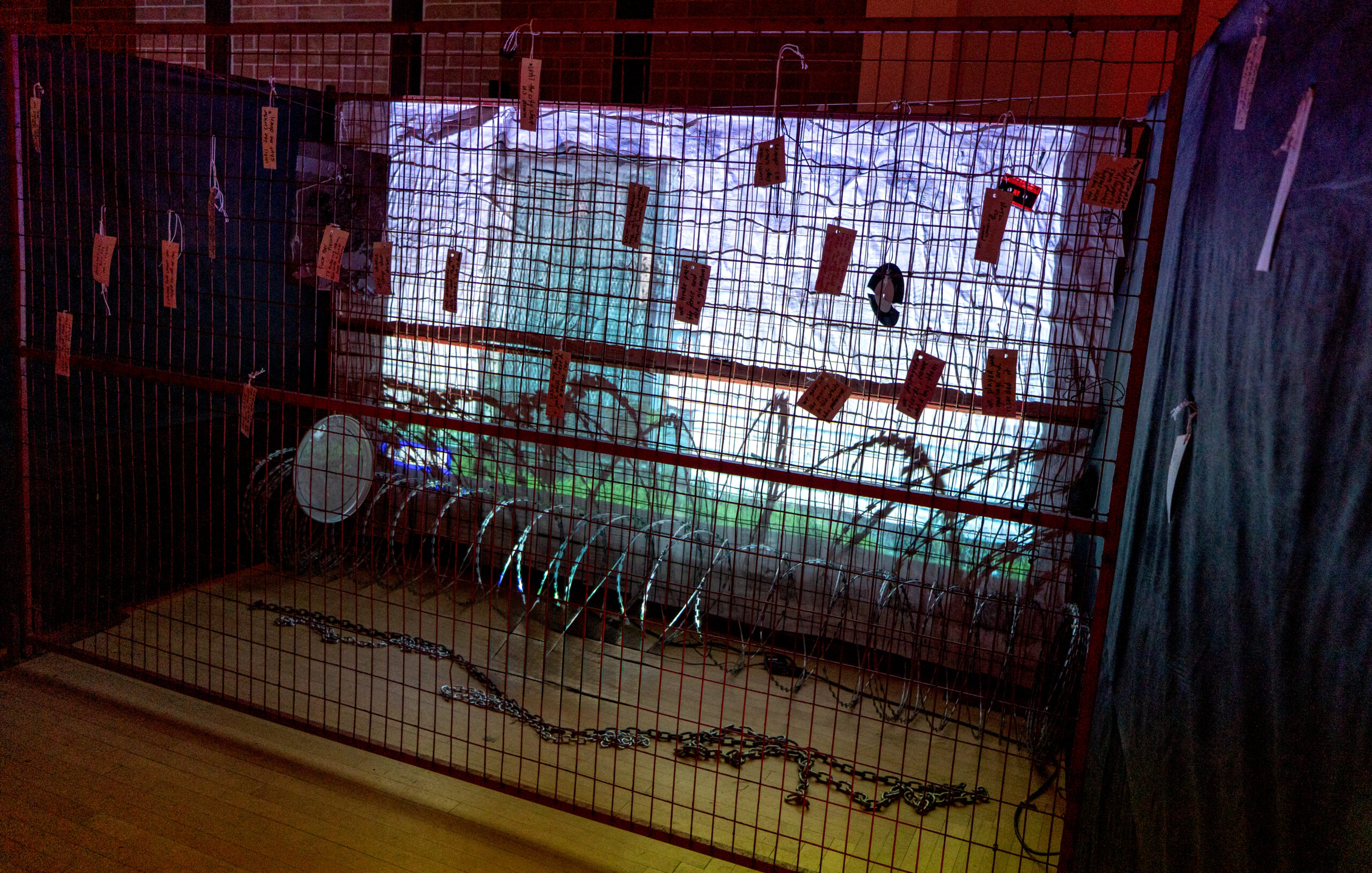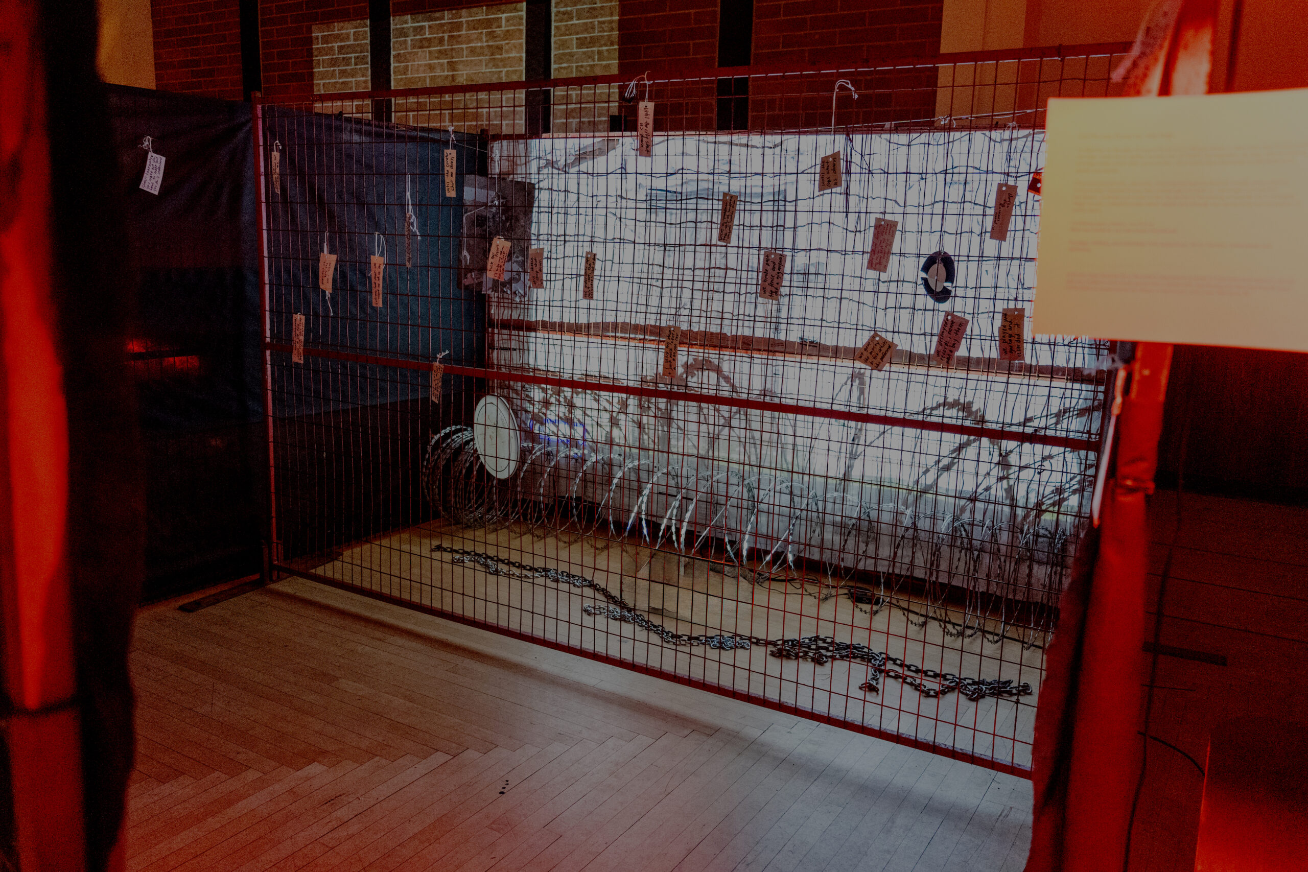 Fence, razor wire, video, collage of City of Vancouver by-law and development applications (projection surface), found objects (metal, broken records, tape), paper tags for testimonials (from research and visitor additions through the exhibition period), sound collage