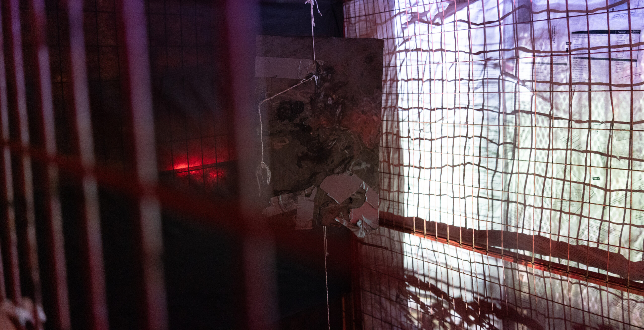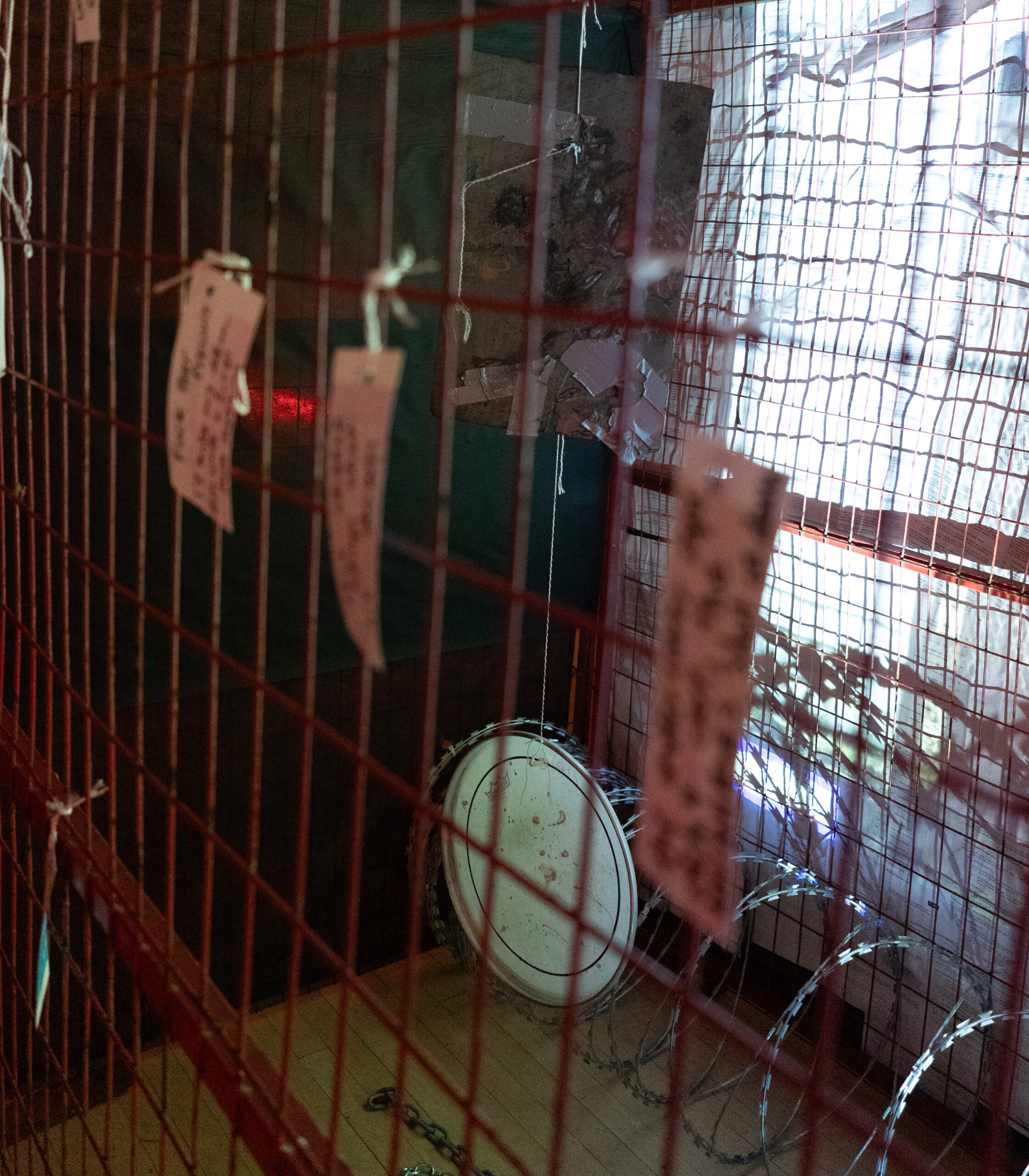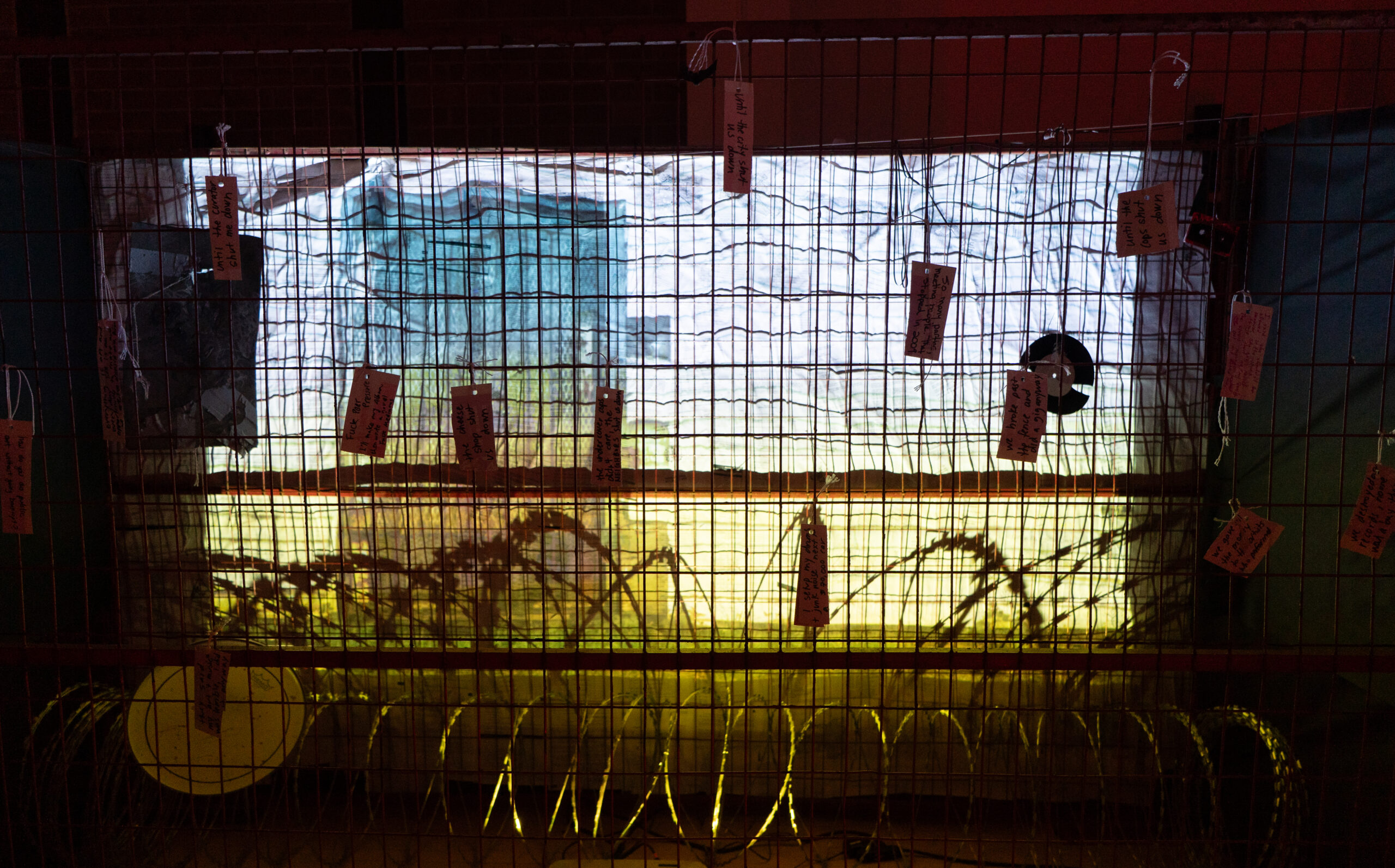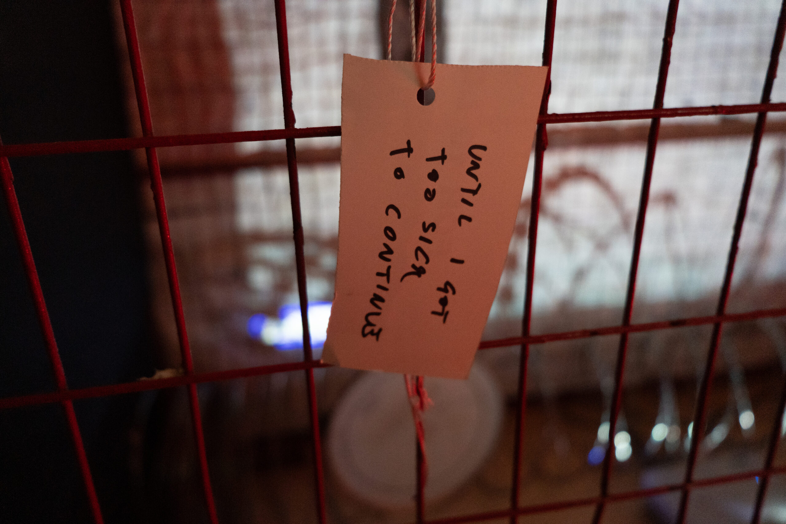 Fence, razor wire, video, collage of City of Vancouver by-law and development applications (projection surface), found objects (metal, broken records, tape), paper tags for testimonials (from research and visitor additions through the exhibition period), sound collage