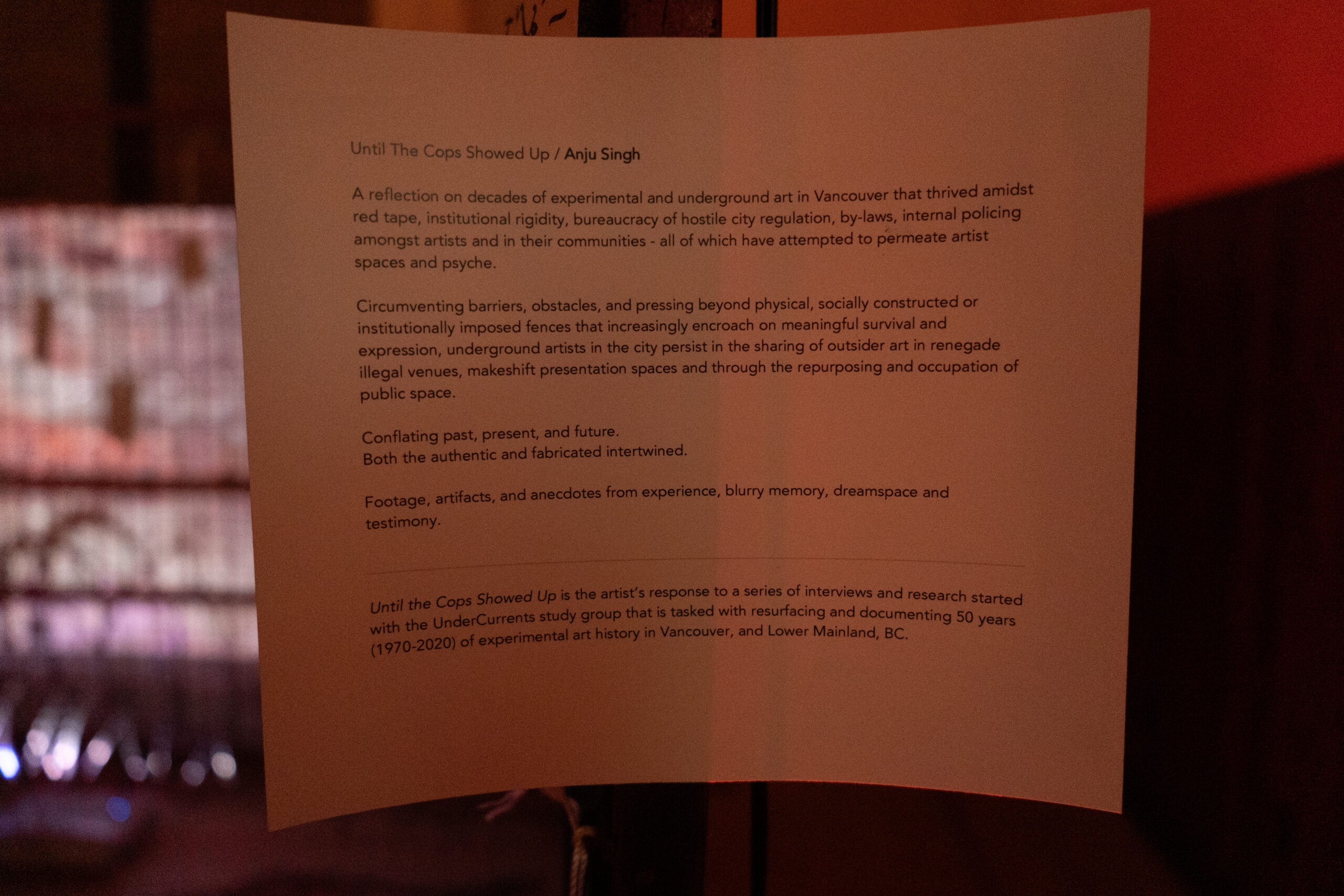 Until the Cops Showed Up is the artist’s response to a series of interviews and research started with the UnderCurrents study group presented by Currently Arts Society that is tasked with resurfacing and documenting 50 years (1970-2020) of experimental art history in Vancouver and the Lower Mainland, BC.